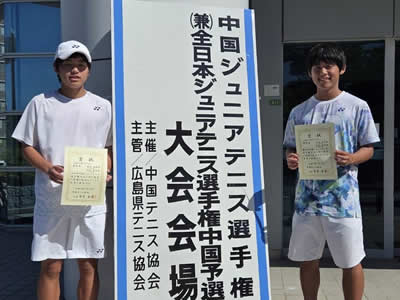 7月18日〜24日にかけて広域公園テニスコートにて行われた中国ジュニアテニス選手権大会の結果を報告いたします。 16歳以下男子ダブルス 第4位 山崎敬史 松永新平 14歳以下女子ダブルス ベスト8 山本愛子 工藤ペア おめでとうございます。