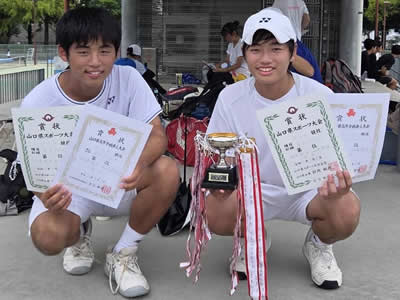 5月31日、6月1日、2日、8日にかけて維新百年記念公園テニス場にて行われた山口県高等学校総合体育大会テニス競技の結果を報告いたします。 男子団体 優勝 防府高校 山崎敬史(シングルス1) 松永新平(シングルス2) 女子団体 第5位 防府高校 古澤未来(シングルス2) 個人戦 男子シングルス 第4位 山崎敬史 個人戦 男子ダブルス 第3位 山崎敬史 松永新平 防府高校の男子団体優勝は36年ぶりの快挙。山崎敬史くんと松永新平くんは1年生ながら全勝で優勝に貢献しました。また防府高校女子団体でも古澤未来さんが全勝しました。 おめでとうございます。